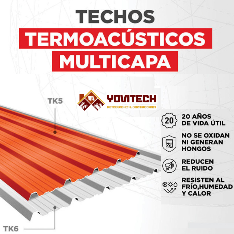 Los techos termoacústicos son estructuras diseñadas para ofrecer aislamiento térmico y acústico, lo que significa que ayudan a mantener la temperatura adecuada y a reducir el ruido. Estos techos están compuestos por materiales especiales que absorben el sonido y aíslan el calor o el frío, proporcionando mayor confort dentro de los edificios. -Aislamiento térmico: Ayudan a mantener una temperatura estable dentro del inmueble, lo que reduce la necesidad de usar sistemas de climatización. -Aislamiento acústico: Atenúan los ruidos externos, mejorando el ambiente interno. -Materiales: Generalmente, están hechos de láminas de acero galvanizado o aluminio, y en su interior tienen materiales como poliuretano expandido, lana de vidrio o poliestireno. -Resistencia: Son altamente duraderos, resistentes a la corrosión, a cambios climáticos extremos y requieren poco mantenimiento. -Uso: Son ideales para aplicaciones industriales, residenciales y comerciales.